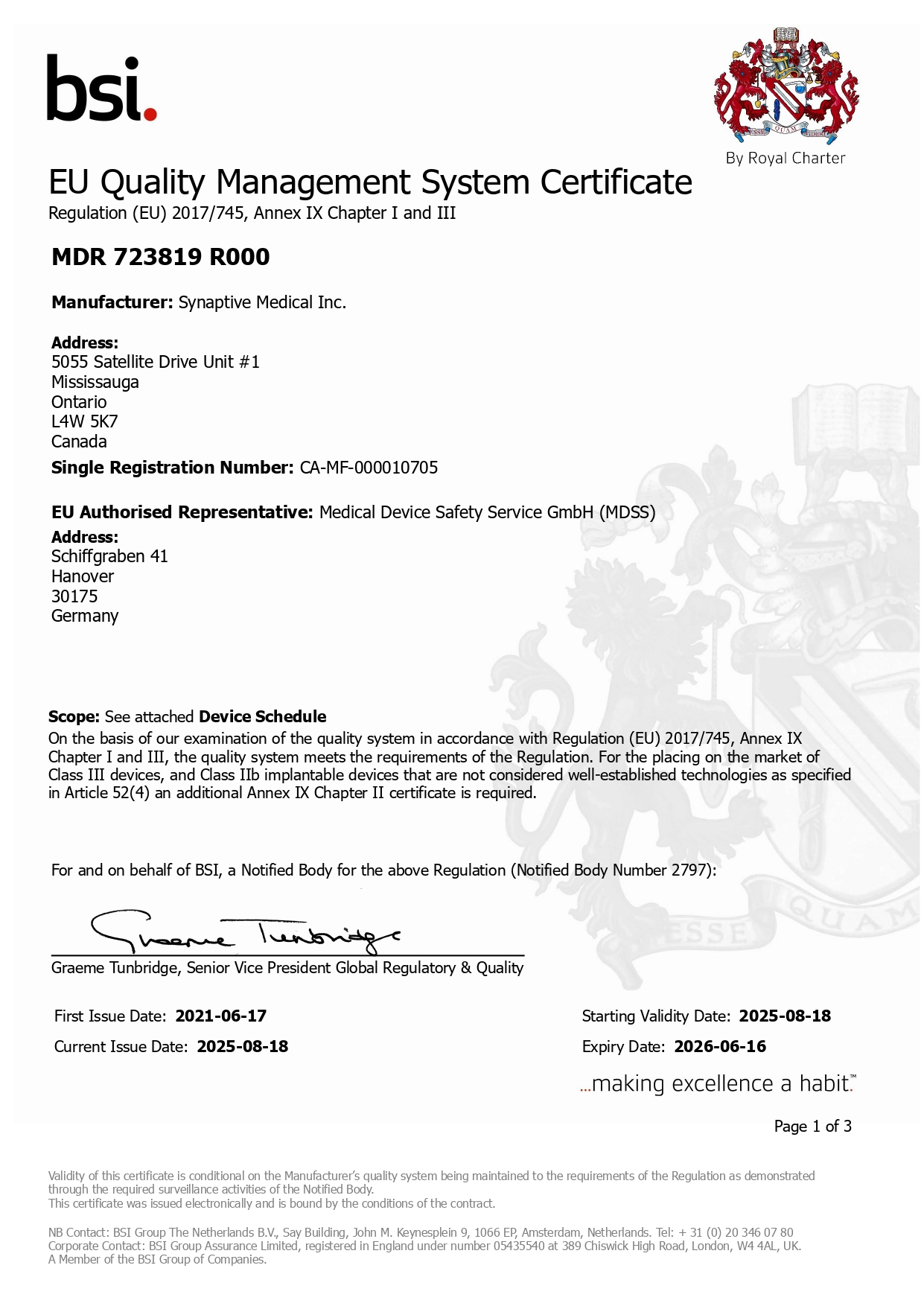 Synaptive Medical is a MDSAP, ISO 13485 registered company. We are committed to providing exceptional quality in our products and services, and we actively listen to feedback from our customers and medical professionals to ensure optimum product performance in diagnostic imaging and the operating room. All products offered for sale meet IEC 60601 standards for safety and electromagnetic compatibility. In addition, ISO 14971 (risk control standard) is applied from design and development to final delivery.